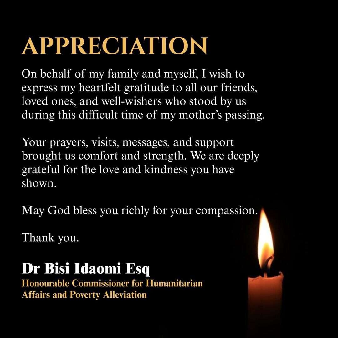 The Edo State Commissioner for Humanitarian Affairs and Poverty Alleviation, Dr Bisi Idaomi, has expressed deep appreciation to political leaders, colleagues and well-wishers across the state for their overwhelming support following the death of his mother.