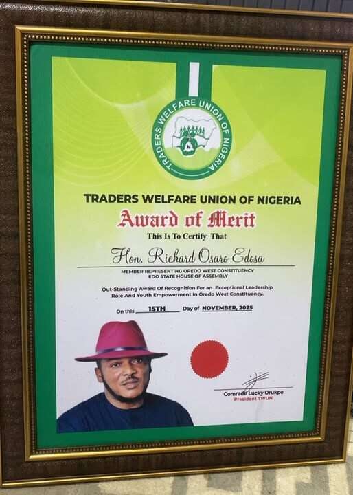 The member representing Oredo West in the Edo State House of Assembly, Hon. Dr Richard Osaro Edosa, has been awarded a Merit Award by the Traders’ Welfare Union of Nigeria, underscoring growing pressure on policymakers to confront the persistent challenges facing traders across the State.