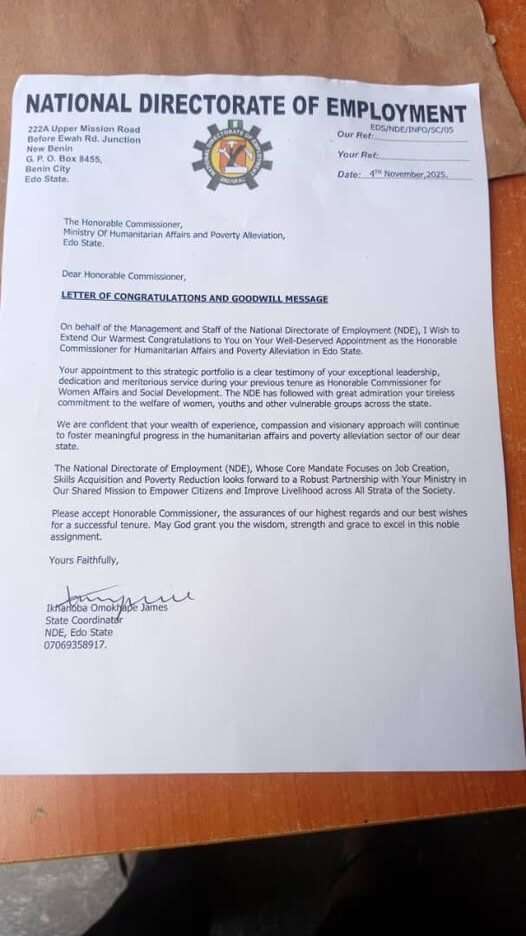 The National Directorate of Employment (NDE) has congratulated the newly appointed Edo State Commissioner for Humanitarian Affairs and Poverty Alleviation, Dr Bisi Idaomi, describing her appointment as well-deserved and a reflection of her compassion and leadership.