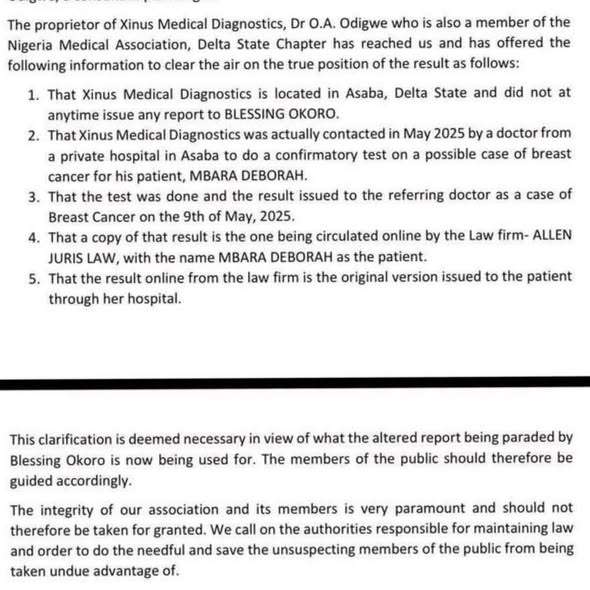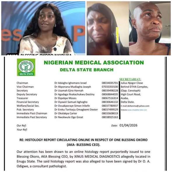 The Delta State chapter of the Nigerian Medical Association has declared that the cancer medical report being circulated by Blessing Okoro is doctored, raising fresh controversy around the embattled relationship coach.