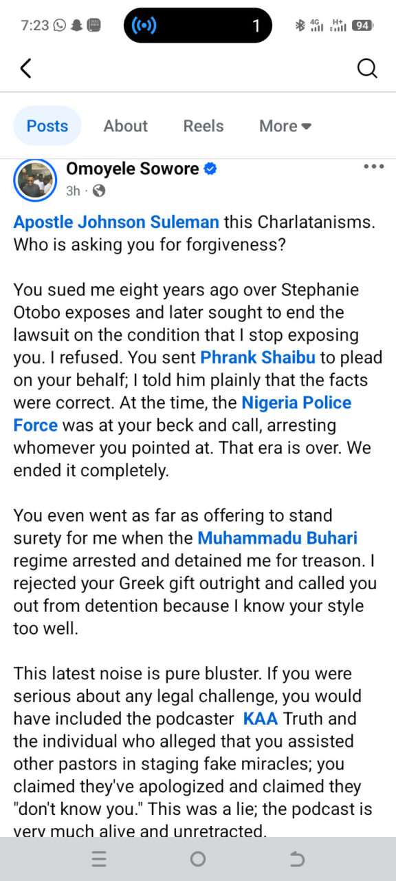 As of the time of filing this report, Apostle Johnson Suleiman had not publicly responded to the latest allegations. The accusations remain claims by Sowore, and no court has ruled on them.