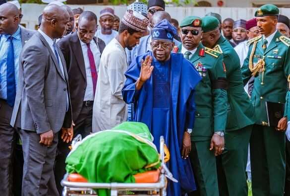 His remains, draped in the national flag, were flown into Nigeria earlier in the day and received at the Umaru Musa Yar’Adua International Airport, Katsina, by President Bola Ahmed Tinubu, Vice President Kashim Shettima, and other dignitaries. From there, the casket was conveyed in a military hearse for the one-hour journey to Daura.