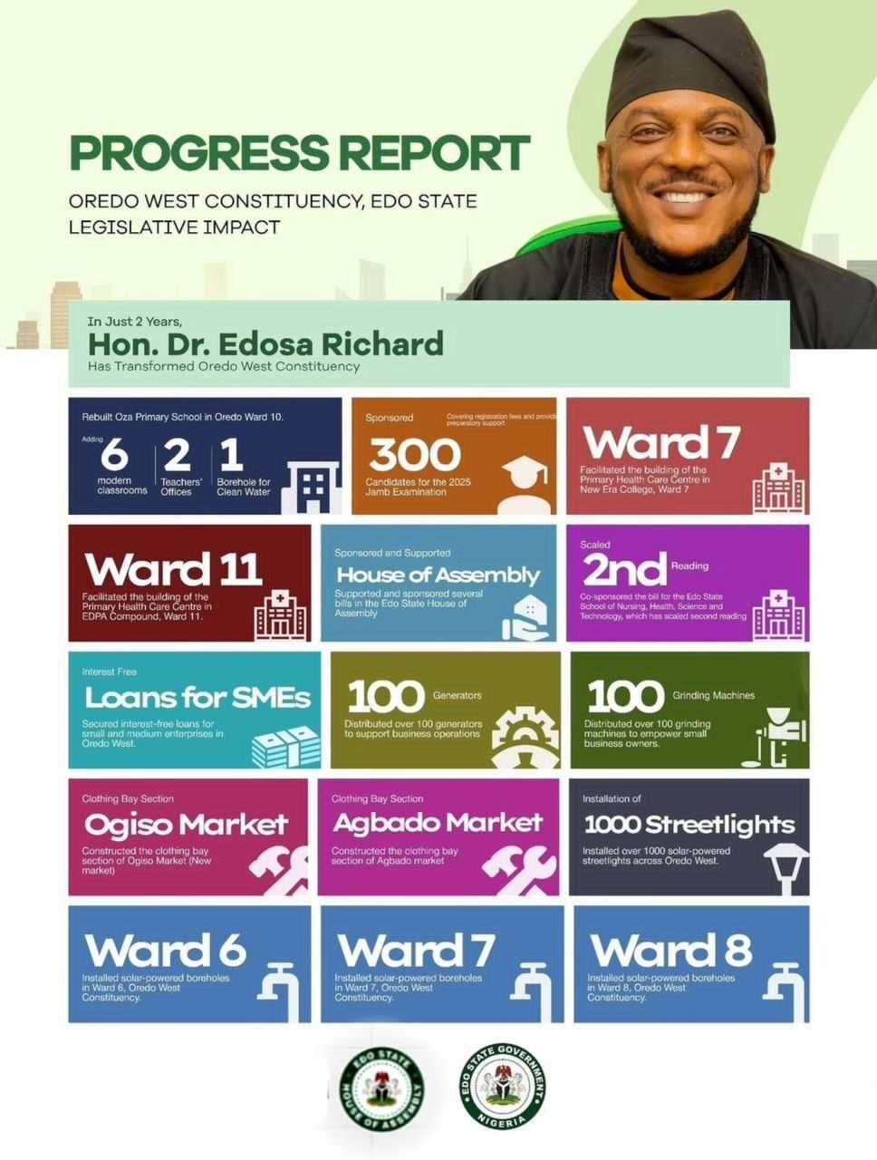 In a message to his constituents, the Member representing Oredo West Constituency in the Edo State House of Assembly, Honourable Edosa Richard, has extended his profound gratitude to the people for their unwavering trust and support over the first two years of his legislative tenure.
